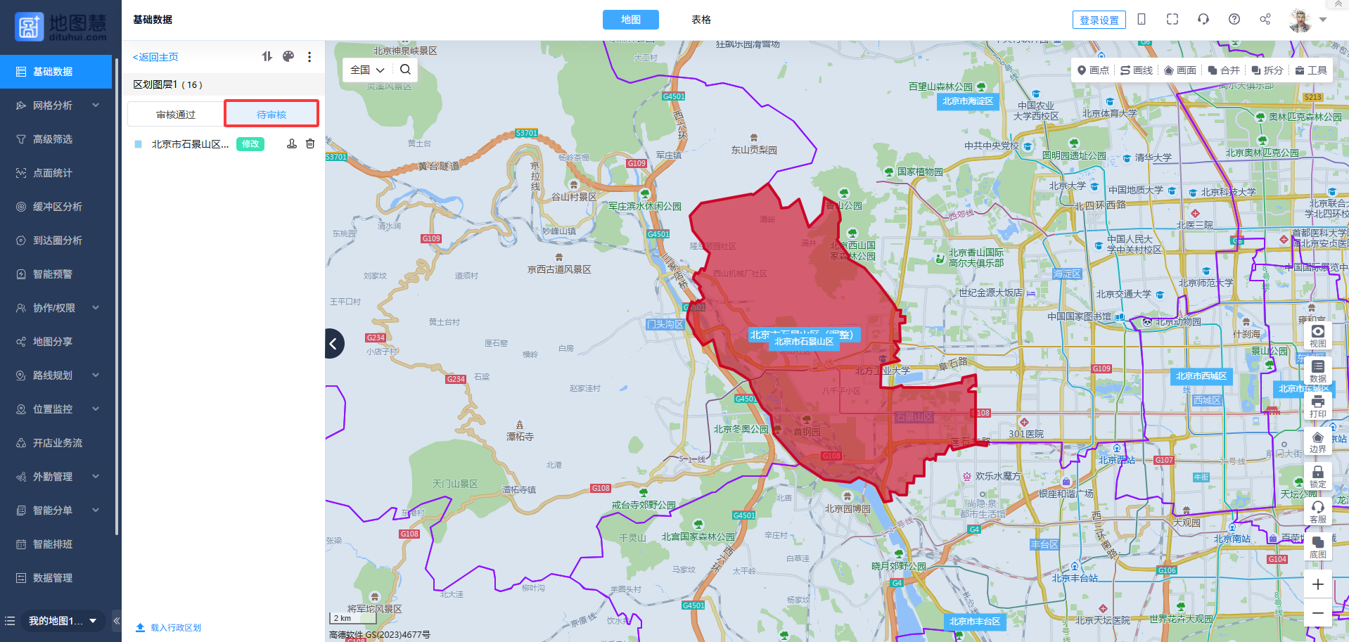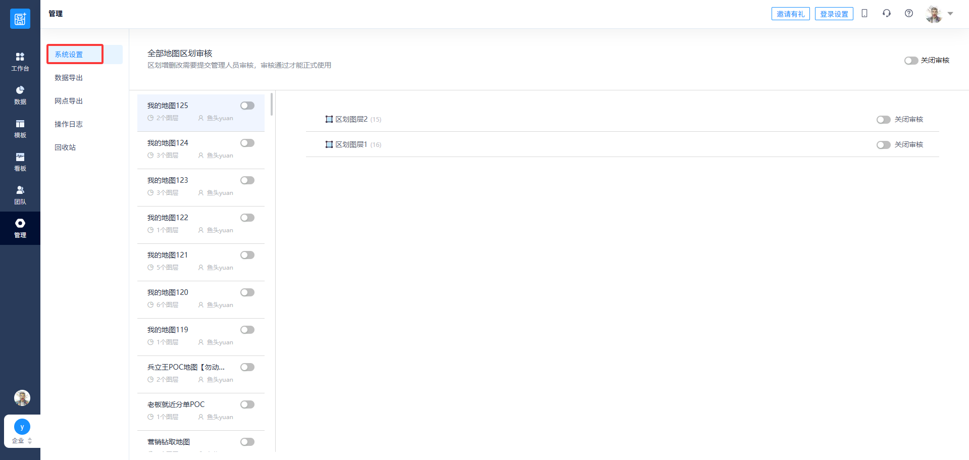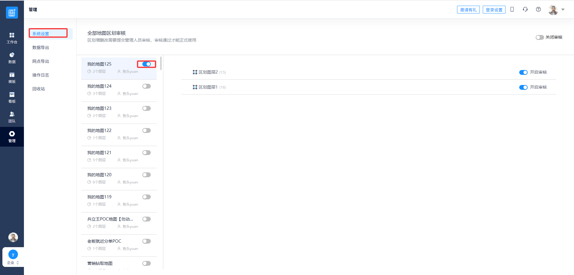 在企业后台-“系统设置”里开启 “区划审核”功能,可对整个团队内所有地图的区划图层进行审核