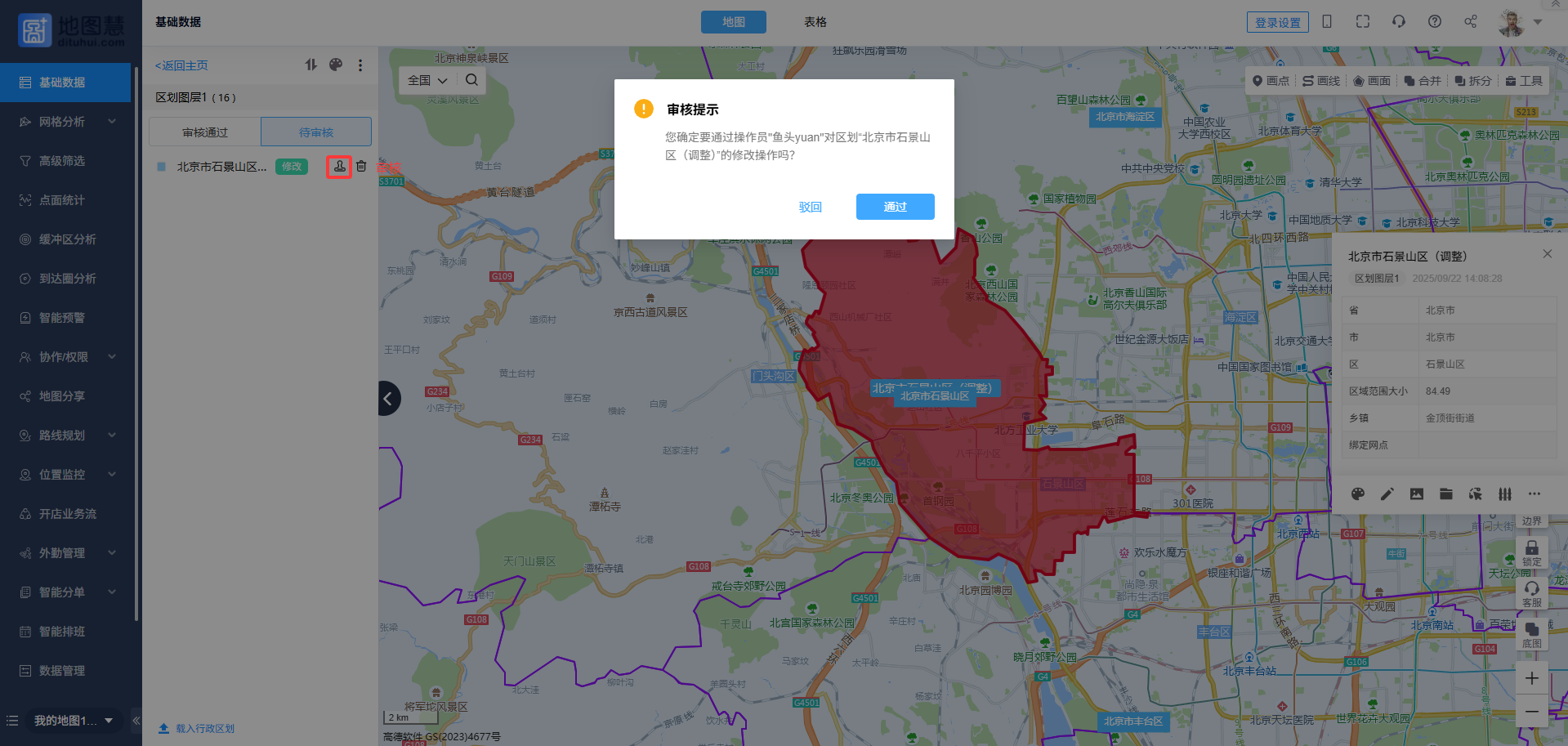 图层管理员可以点击区划数据,点击“审核”按钮,进行“通过”或者“驳回”